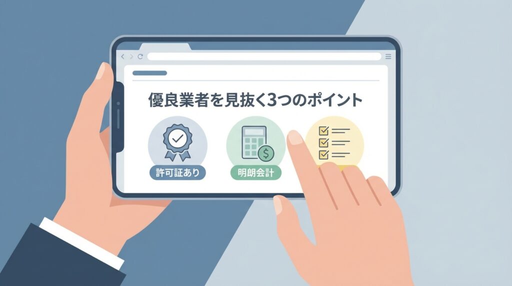 でも、これから紹介する3つのポイントさえ押さえれば、優良業者を簡単に見分けられますよ。